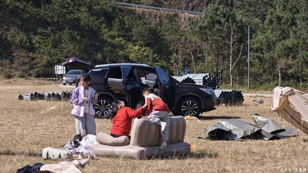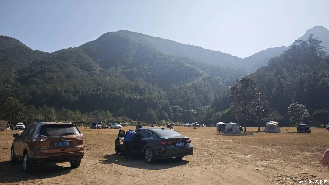 据介绍,这个营地是免费营地,旁边提供有山泉水,可以打水回来洗澡。记者看到有几支队伍是“集体行动”,除了来自高州城与谢鸡镇组团而来的7辆车的团队,来自湛江的是6车组成的团队,在前一天到达,当天留守二人煮粥外,其他人都去登山了。另有一支是年轻家庭组成的团队,他们带有充气气垫、沙发等,给小朋友们提供蹦蹦跳跳的活动场所。