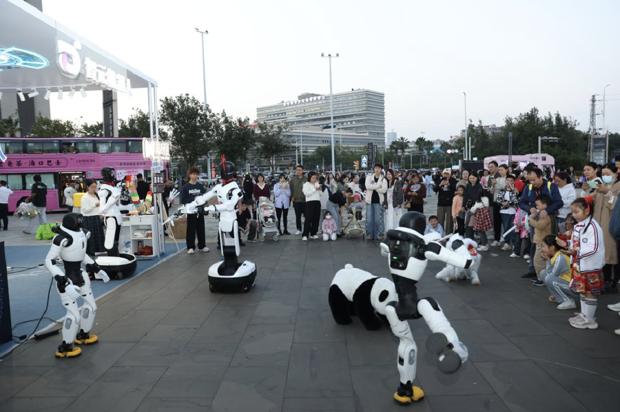 场外快闪店中,远征A2、灵犀X2能和进场的观众们互动问答,更是连连摆出可爱pose拍照;精灵G2则是带来了才艺——抖空竹,观众们可以亲身体验这一民间游艺活动,另一台精灵G2还随着音乐翩翩起舞,跳上了华尔兹。四足机器人D1的熊猫、醒狮造型憨态可掬,引得众人大呼“好萌”。除此之外,机器人们还很会“社交”,和候场的明星们频频互动逗趣儿,暖暖的很贴心。